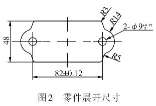 零件形狀簡單對稱,含有落料、沖孔、彎曲3道 工序。2個φ9+0.15孔及2孔中心距(82+0.12)mm 的公差等級分別為ITIO和IT12,其余未注公差,用 普通沖壓加工可以滿足要求。由于零件材料偏厚, 塑性較好,兩側彎曲直邊高度為9 mm,控制彎曲回 彈將成為該零件的主要成形難點。模具設計時必 需采取措施解決回彈問題,為保證零件質量,彎曲 時應使彎曲線與纖維方向垂直,毛刺面的一側處于 彎曲受壓的內緣。