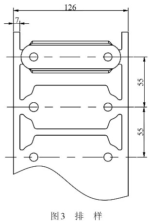 綜合以上分析,為提高材料利用率,各工位間 應排列緊湊,采用單排排列、雙側載體的排樣方式, 排樣如圖3所示,條料寬度為126 mm,搭邊7mm,步 距55 mm。工序為:①沖2個φ9+0.15mm孔;②沖切外 形廢料;③彎曲成形及沖切兩側載體。