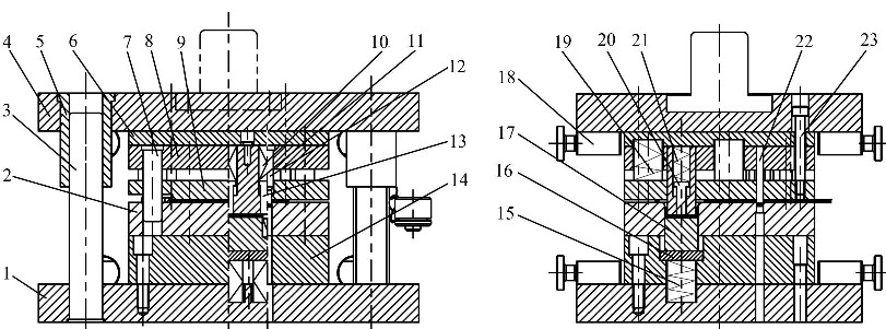 (4)為了簡化模具結構,節(jié)省模具材料,彎曲成 形與切斷載體設計在同一工位。在此工位中,彎 曲一切斷凸模11、凹模2的前后工作部位均倒圓角, 完成彎曲成形,左、右兩側工作部分為鋒利的刃口 結構,完成載體分離。故凸、凹模四周的配合間隙 是不一樣的,前后成形部位凸、凹模單邊配合間隙 為3 mm,左右沖切部位的凸、凹模單邊配合間隙為 0.23mm。在彎曲一切斷凸模11上除安裝有2個浮動 導正銷13外,還安裝有1個退料銷20,起卸件作 用。在凹??變扰溆袕椥皂敿K17,既起到頂件的 作用又起到壓料的作用,確保卻料安全,降低彎曲 回彈,提高零件質量。