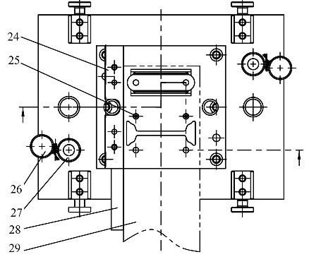(3)條料的送進導向采用單側導料板和導料塊 限位,首次送進定距靠異形凹??椎暮笾边叾ㄎ?, 沖切外形廢料時靠兩定位銷25定位,彎曲成形采用 兩浮動導正銷13精確定位。為了保證零件的尺寸 和位置精度,模具裝配后,每步的步距誤差<0.005 mm,步距累積誤差<0.01 mm。