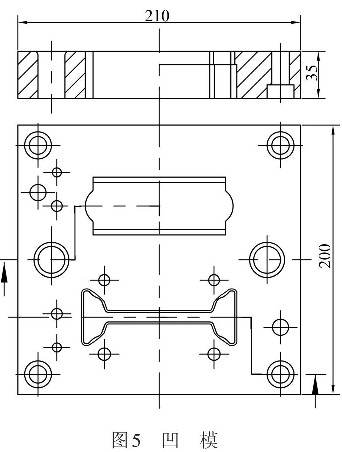 (1)凹模結構如圖5所示,為了簡化模具結構, 便于制造,凹模采用整體式結構,材料選用 Cr12moV,熱處理硬度60-64 HRC,刃口型孔采用慢 走絲線切割加工,工作部分的尺寸公差按IT5級制 造,各孔的位置誤差<0.005 mm。沖裁刃口與凸模的 雙邊配合間隙為0.12 mm。凹模的主要失效形式為 廢料堵塞,從而導致凹模脹裂,凹模刃口設計成直 壁加臺階漏料孔的形式。