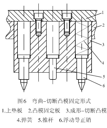 (4)彎曲一分離凸模結構采用直通式,材料選用 與熱處理要求、加工方式與異形凸模相同。結構形 式及其固定方法如圖6所示,導正銷與導正孔的雙 面間隙設計為0.04 mm。